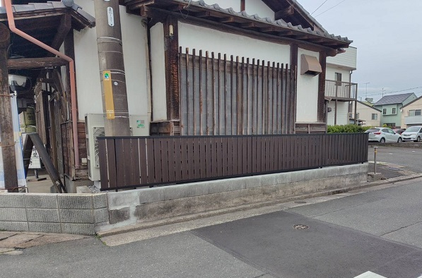 建物の雰囲気のあわせてセレクトした濃い木目の目隠しフェンス。建物と一体感があり落ち着いた和の雰囲気をいかしています。