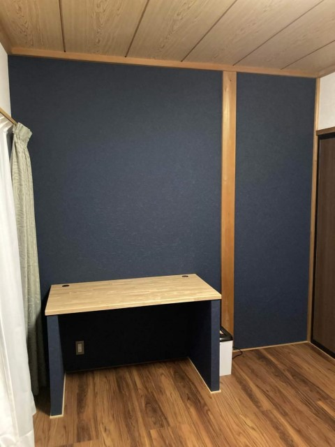 畳をフローリングにし、テレワークスペースへとリフォームした事例です。チーク色の床材とネイビーの壁が落ち着いた印象を与え、集中して作業ができそうな空間になりました。