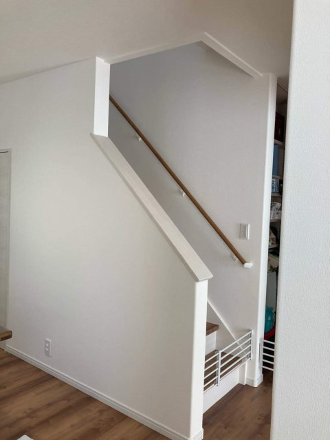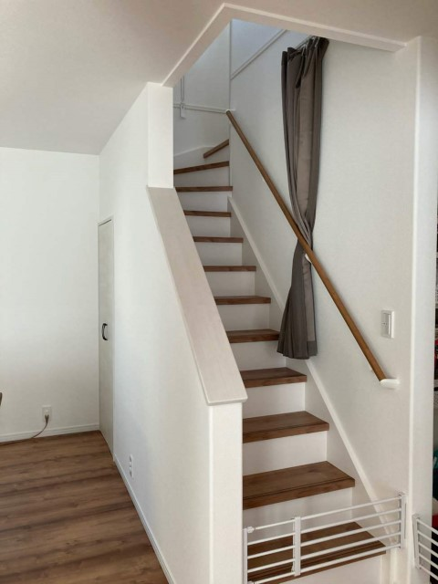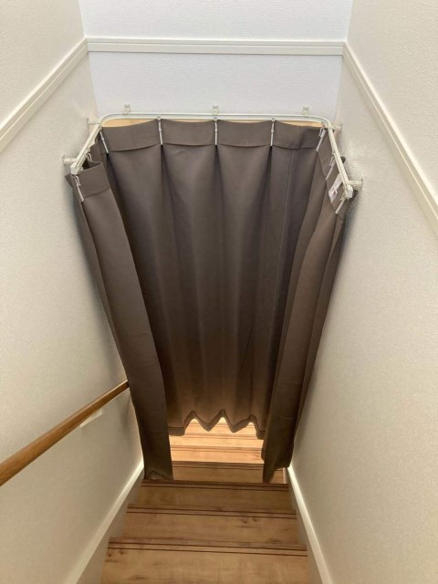 冬のリビング階段からの冷気で室内が寒くなってしまうと悩んでいたS様。そこで、吹抜部にカーテンレールを取付けて、お手持ちのカーテンを利用した寒さ対策をご提案しました。