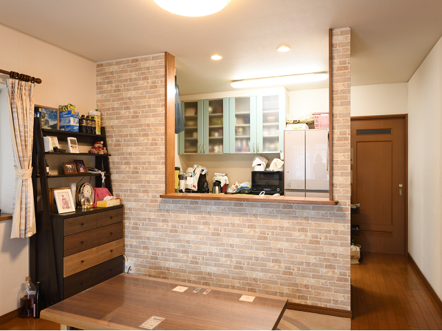 さらに、対面キッチンとダイニングを仕切る壁もレンガ風のクロスに模様替えしたことで、部屋全体の印象が明るくおしゃれな雰囲気に変わりました。汚れや傷が気になっていた壁が、こんなにもきれいになるなんて本当に感激です。