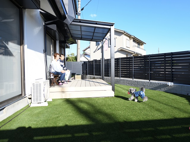 庭は人工芝にしただけでなく、愛犬2匹が自由に遊べるようにゲートを作ってドッグランを兼ねるようにしたんです。さらに、庭にウッドデッキとサンルームも新しく作りました。以前は外に物干し台があるだけでしたが、今は急な雨でも洗濯物が濡れずに済むので本当に便利です。ウッドデッキに座って、愛犬が庭でボール遊びをしたり、走り回ったりする姿を眺める楽しみも増えました。