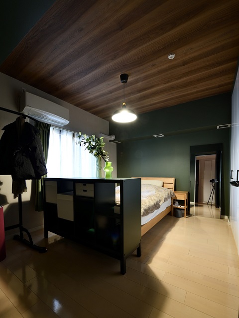 | 室内窓から明かりが入る寝室 | 木目の天井が印象的な寝室 |