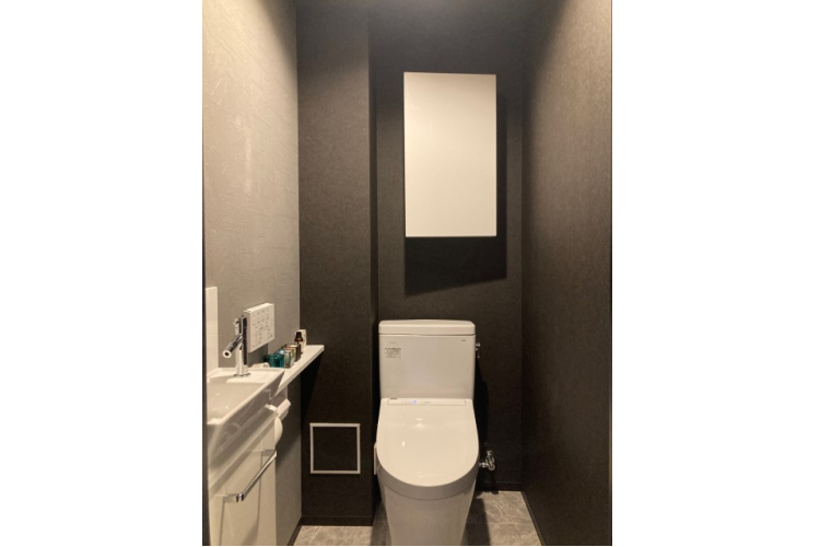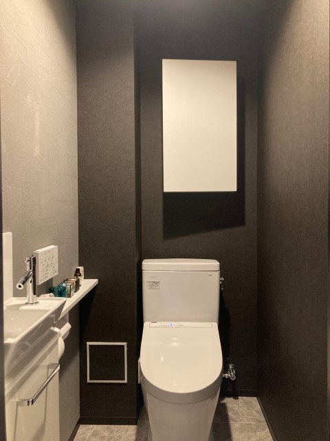 壁紙を暗くして、モダンなデザインと落ち着いた色合いで、トイレ空間が一新されました!