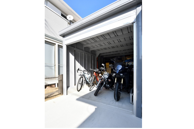 土間タイプを採用することで段差がなく、バイクの入出庫がスムーズに。整備ができる高さも確保し、棚を設置することで道具類も整理しやすい空間となりました。シャッターは軽く開閉でき、防犯性の高いディンプルキーを採用。シャッターレールや水切りスラットをアルミ製にすることで、サビを防ぎ長く快適に使える仕様としています。