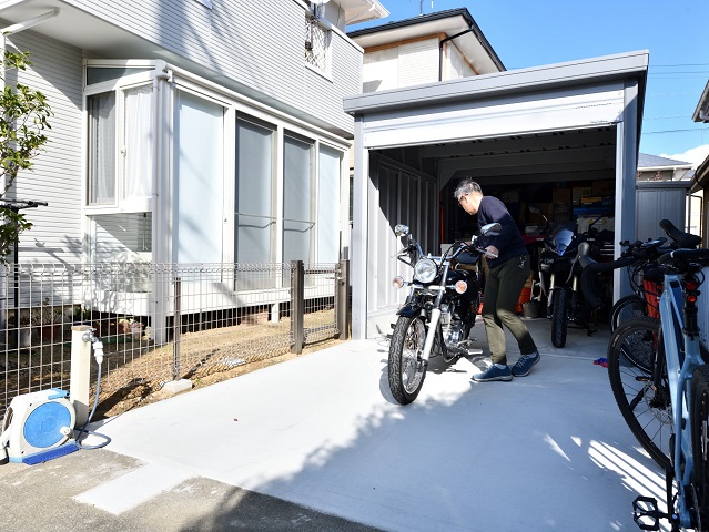 将来的に安心して趣味を続けるため、「バイクをしっかり守れるガレージ」と「自転車をラクに出し入れできる環境」の実現がご要望でした。遠鉄ホームでの新築以来、外壁リフォームなど長くお付き合いのある遠鉄のリフォームへ、今回も迷わずご相談いただきました。